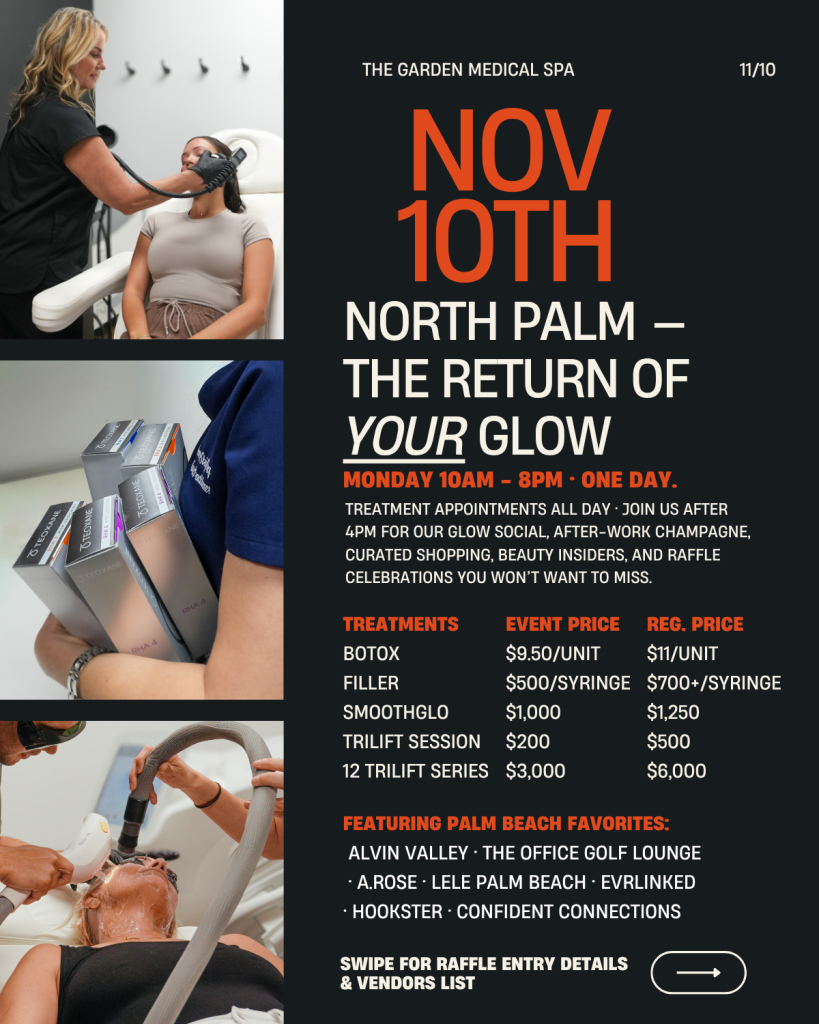 From North Palm Beach to Tampa Bay, The Garden Medical Spa is hosting a series of exclusive events featuring our top injectors, luxurious settings, and special limited-time pricing. Whether you’re joining us for champagne and live injections or a rejuvenating wellness pop-up, each event is designed to elevate your natural beauty — no fluff, just results.