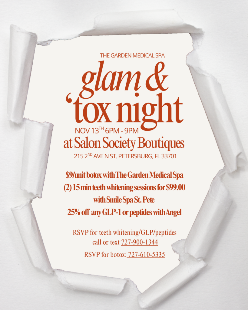Sip, glam, and glow with The Garden Medical Spa during this exclusive night at St. Pete’s most beautiful salon collective.