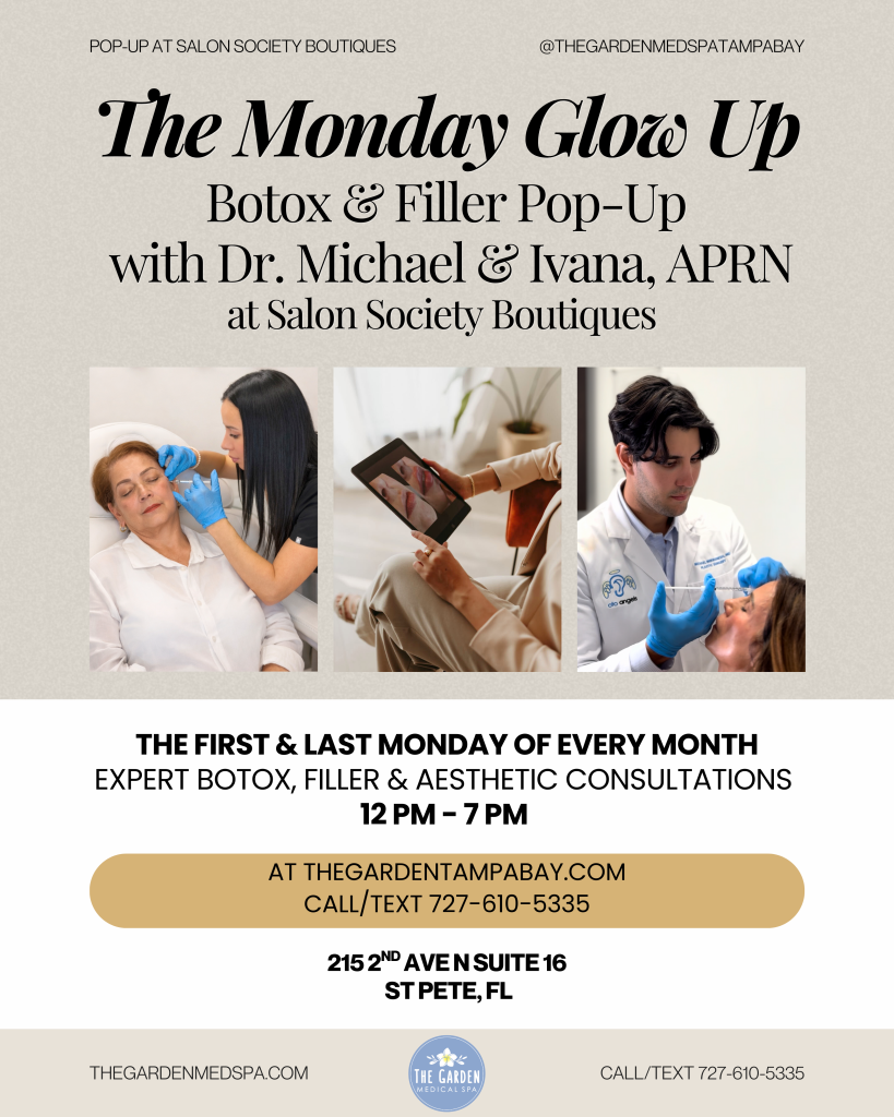Held at Salon Society Boutiques in Downtown St. Petersburg, The Monday Glow Up takes place on the first and last Monday of every month, from 12 PM to 7 PM. This recurring pop-up brings trusted Garden Medical Spa providers like Dr. Michael Mirmanesh and Nurse Practitioner Ivana to a central, elevated location for seamless treatment days.