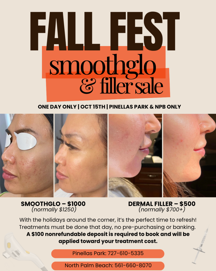 Get ready for our most anticipated event of the season! On Tuesday, October 15th, The Garden Medical Spa in Pinellas Park & North Palm Beach are hosting an exclusive Fall Fest SmoothGlo & Filler Sale Pinellas Park is featuring treatments with Dr. Michael Mirmanesh, board-certified plastic surgeon and aesthetic expert, and Natacha Christeler, APRN, a nationally recognized Top 100 Master Injector. North Palm Beach will be performed by aesthetic expert & injector Vanessa, APRN.